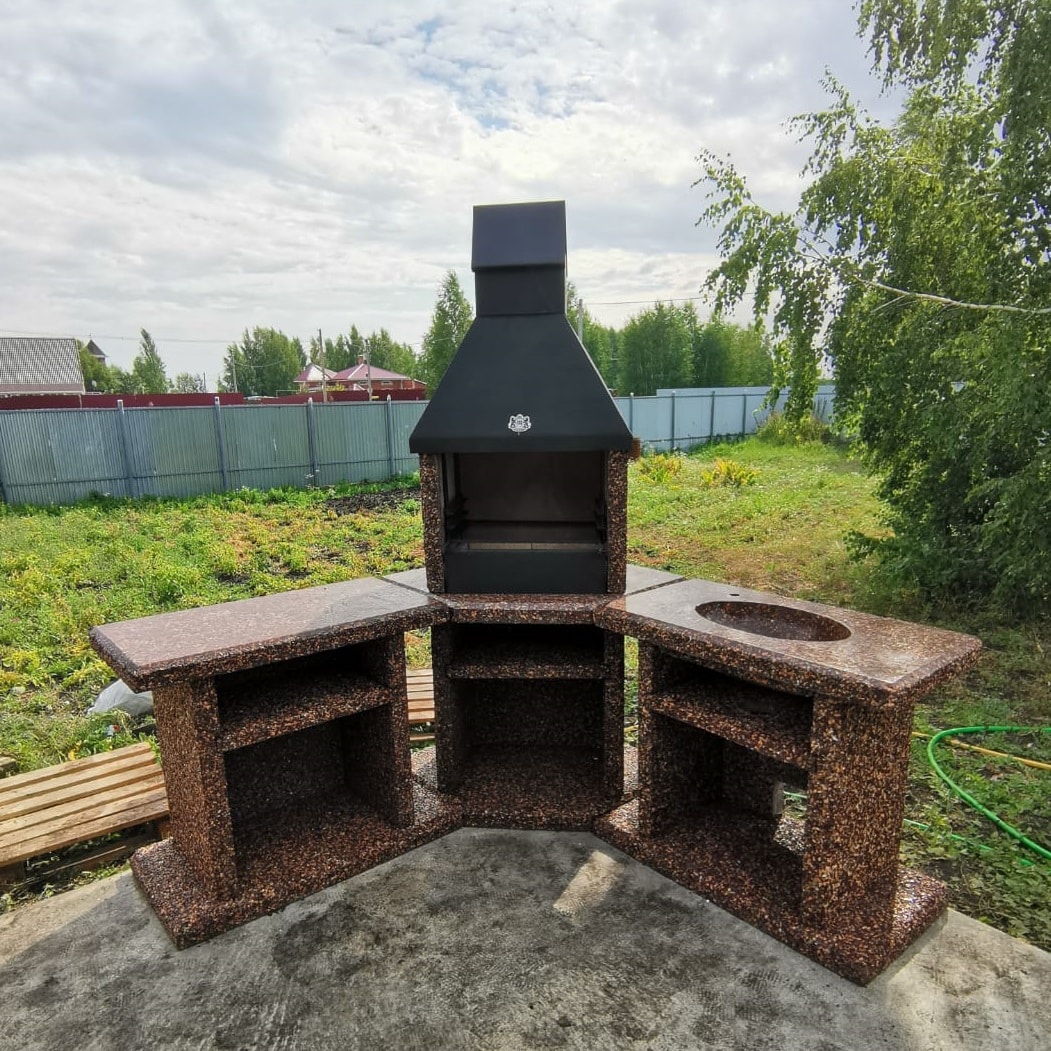 Барбекюшница в фактуре «Песчаная буря» — динамика яшмы, златолита и кремния. Зона со столиком и угловой конструкцией — идеальное решение для семейных обедов.Преимущества:Жаропрочный бетон М600 и натуральный камень — выдерживают тысячи циклов нагрева до 1200°C и Лакированная поверхность — устойчива к загрязнениям.Печь шириной 1185мм — компактно для установки в углу