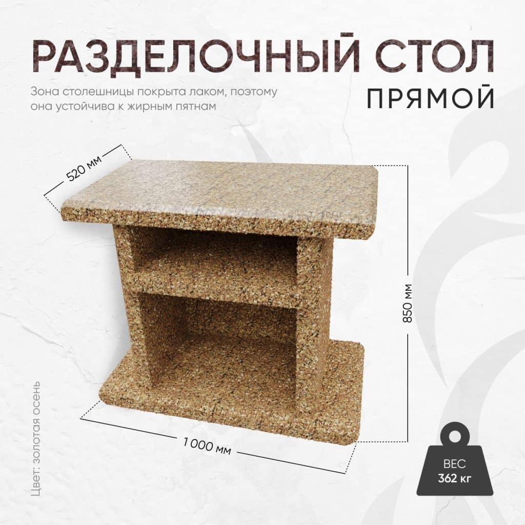 Теплота и роскошь в каждой детали! Фактура «Золотая осень» из златолита переливается золотистыми и медными оттенками, напоминая осенний лес. Стандартная высота 850мм обеспечит удобство работы за столом, снижая нагрузку на спину во время приготовления блюд. Стол разделочный не только функционален, но и становится элементом декора.Преимущества:✔️Устойчив к влаге и ультрафиолету — подходит для открытых террас.✔️2 полки для хранения — все необходимое под рукой.✔️Совместим с барбекю-печами — создайте уютный уголок для готовки.