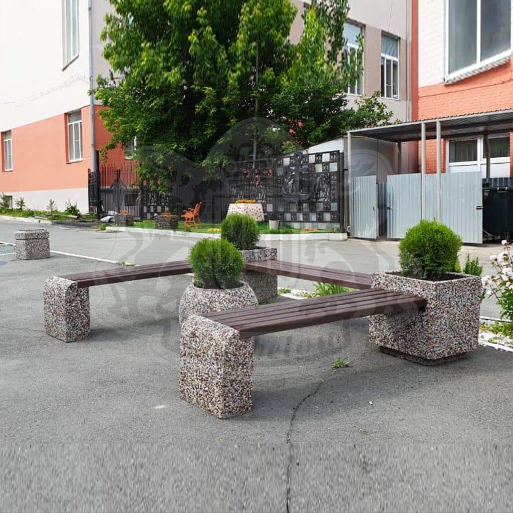 Уличная скамья из натурального камня и сосны ДхШхВ: 2200х2500х500мм Вес 460кг Изделия Разнообразие цвета и фактур В составе полудрагоценные камни из Уральских гор (Яшма Златолит Змеевик Кремний Мрамор Габбро-диабаз Фельзит) Качественные изделия. Бетон прочности М600 и морозостойкости F300-350 Возможности Изготовление нестандартных дизайнерских решений Собственное производство под любой запрос Ежегодно благоустраивается более 100 000 в.м скверов и парков Более 3000 довольных клиентов по благоустройству собственных участков Подход Личный менеджер – сопровождение на всех этапах сотрудничества от разработки сметы до выполнения на объекте и даже после Гибкие индивидуальные условия сотрудничества включающие Ваш интерес Стоимость и порядок оплаты зависят от объема работ. Скидки до 30% 10 лет безупречной работы профессионалов